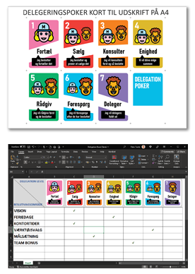Udskriftskabeloner af delegeringspoker kort på dansk og engelsk.