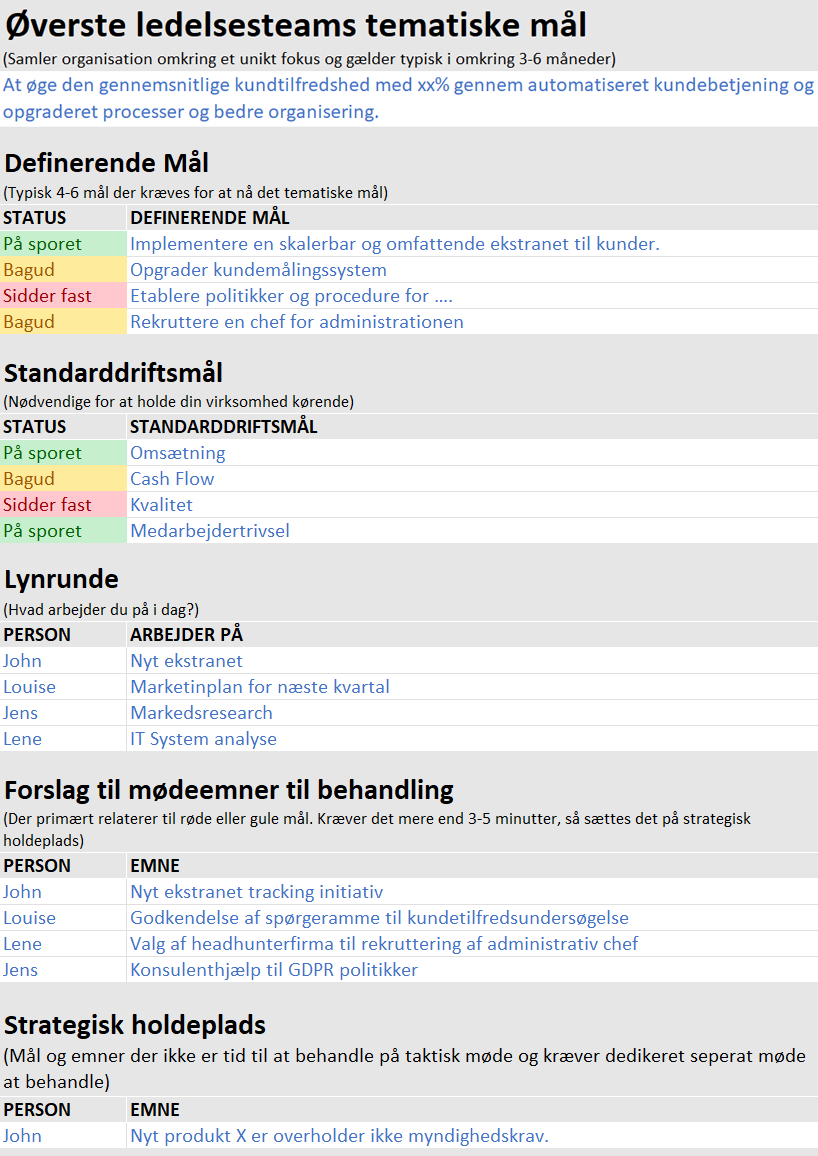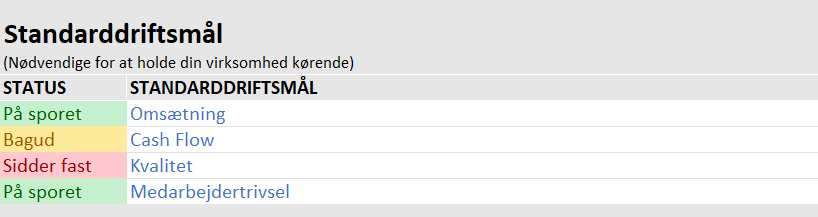 Status på mål og standard driftsmål bør opdateres før eller i begyndelsen af mødet med en rød/gul/grøn indikator (Grøn = på sporet, Gul = bagud, Rød = sidder fast eller blokeret).