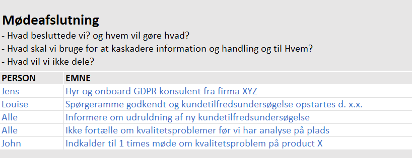 For at være afstemt og ansvarsfølelsen, er det vigtigt at gennemgå de trufne beslutninger og tildele ansvaret for opfølgende handlinger. (tip: dette burde nok være en person hvis profil passer til denne opgave).
