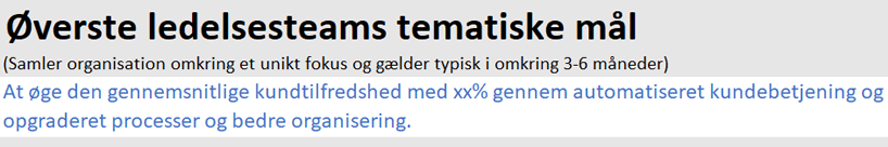 Det tematiske mål samler din organisation omkring et unikt fokus. Dette mål bør fastlægges af ledere og føres hele vejen ned i organisationsdiagrammet for at hjælpe alle med at afstemt om hvad der er vigtigst.